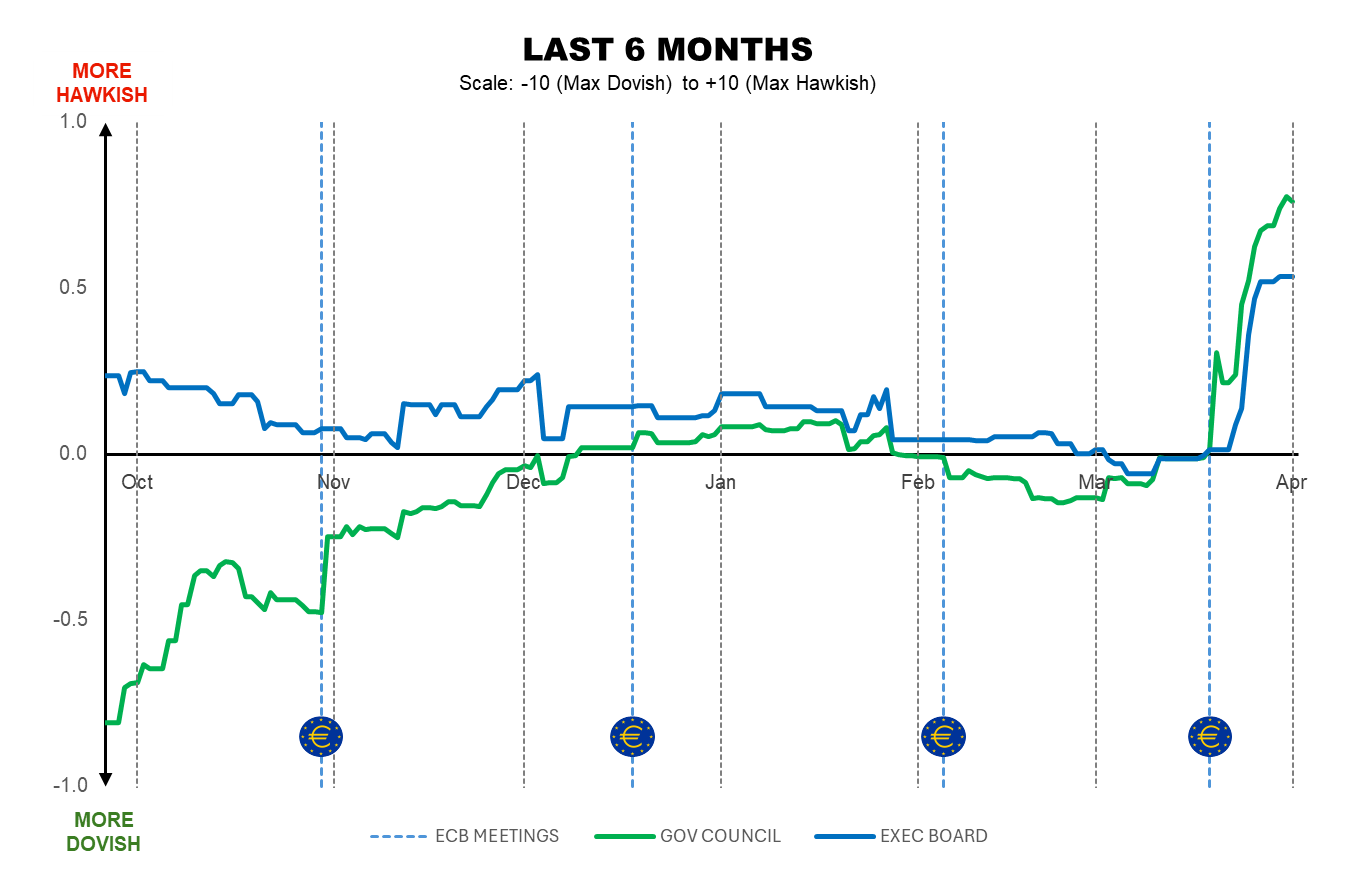 By Marta Vilar – MADRID (Econostream) – Econostream’s ECB Tone Meter showed a notable shift in tone this week, with both the Governing Council and the Executive Board moving into what we classify as ‘slightly hawkish’ territory.